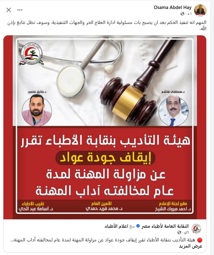 The source pointed out that this is the first time that the Medical Syndicate has taken disciplinary measures, by stopping the doctor, Awad’s quality, from practicing activity for a year.