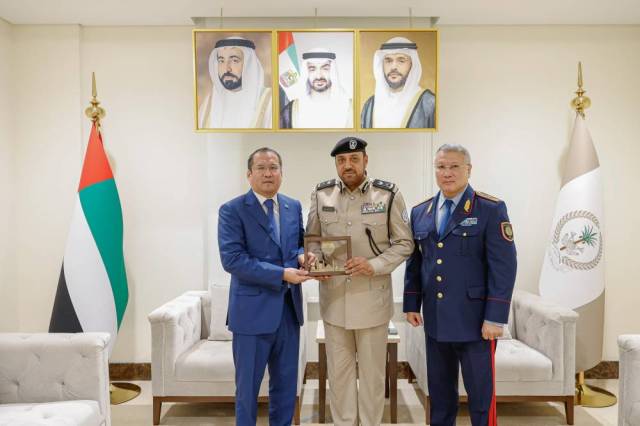 Major General Abdullah Mubarak bin Amer, Commander -in -Chief of Sharjah Police, received Almaz Tablawaba, the Consul General of the Republic of Kazakhstan, and Major General Ian Duisimbayev, representative of the Ministry of Interior of the Republic of Kazakhstan in the UAE, and his accompanying delegation, and the meeting was held at the headquarters of the Sharjah Police General Police, in the presence of a number of specialized general managers. They discussed a number of topics of common concern. They also reviewed their experiences in the areas of security, and discussed the prospects for enhancing cooperation and exchanging experiences, in order to contribute to supporting and developing security efforts. The meeting included a field tour at the Operations Center, during which the Consul General and his accompanying delegation were briefed on the most prominent technologies and systems
